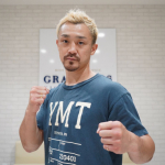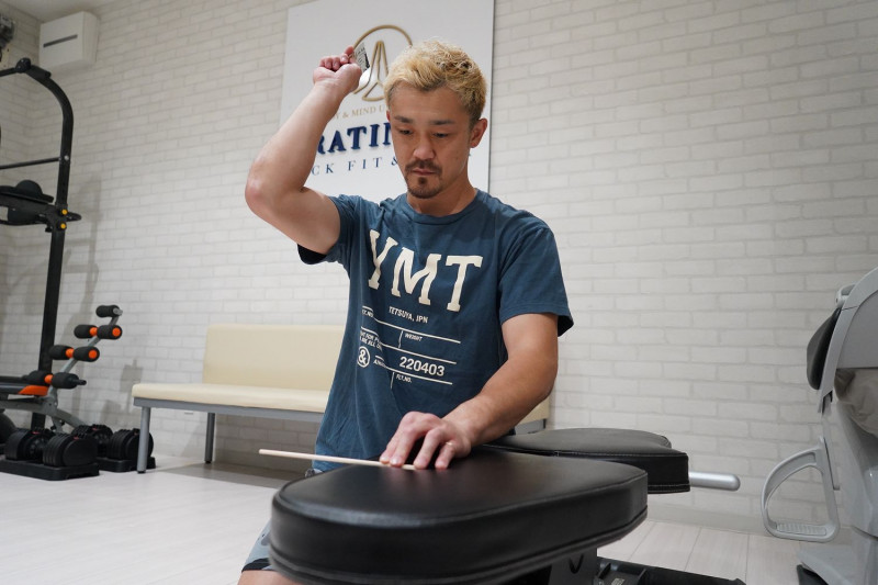 割り箸を置いて、紙の名刺で真っ二つに折って見せた(C)K-1