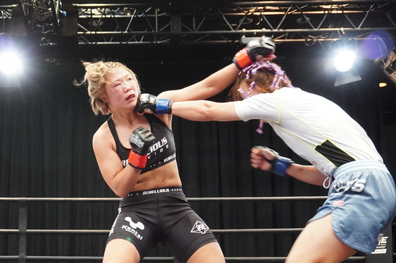 SARAMIにパンチを当てるキム・ソユル(右/2019年10月)