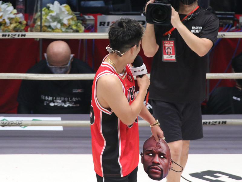 20年8月、那須川に挑戦すべくメイウェザーの面をかぶってリングインした皇治