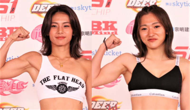 ケイト・ロータス(左)と竹林愛留(右)が計量パスしてマッスルポーズ