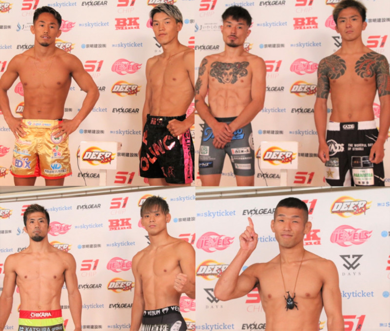 フライ級GP1回戦4試合。村元友太郎vs.風我(左上)、福田龍彌vs.杉山廣平(右上)、島袋チカラvs.宇田悠斗(左下)、松場貴志(右下、駒杵は欠席)