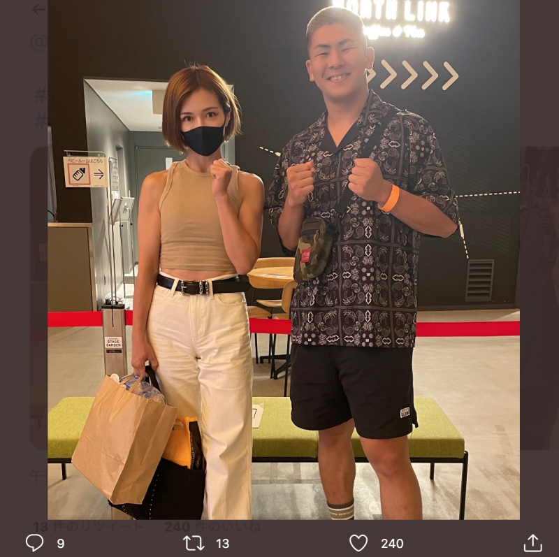 ノースリーブ、へそ出しコーデあきぴとUFCと契約した木下憂朔(あきぴ インスタより)