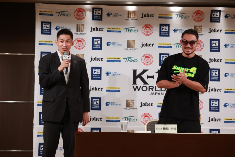 会見で75kgの階級創設を発表する中村プロデューサー(左)、神保(右)の念願が叶った