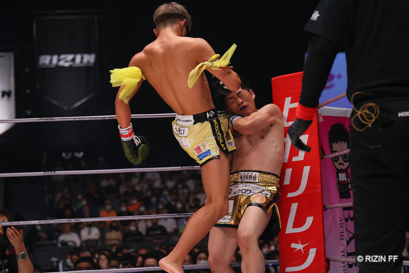 飛びヒザ蹴りをヒットさせる龍聖(2022年7月)