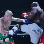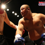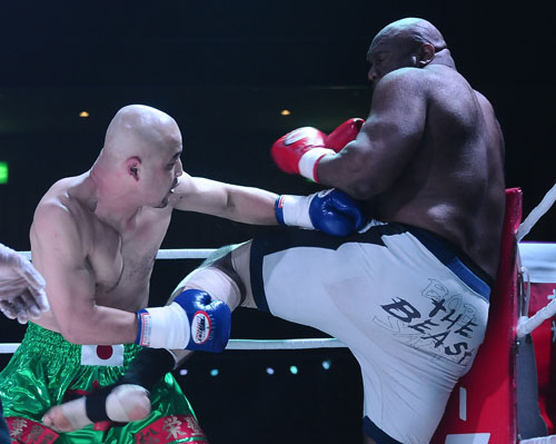 ボブ・サップにパンチを打ち込む西島洋介(左/2013年11月)