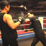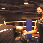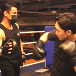 朝倉の右フックで魔裟斗のミットが弾き飛んだ(『魔裟斗チャンネル』より)