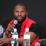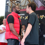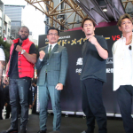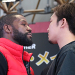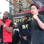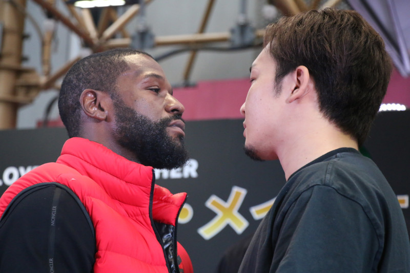 メイウェザー(左)と朝倉がバチバチのフェイスオフ