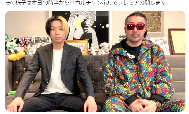 ヒカルと並び謝罪する奥野氏(『ヒカル(Hikaru)チャンネル』より)