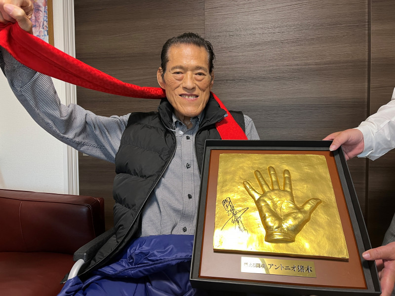 猪木氏が「金箔ビンタ手型」との2ショットで「ダーッ!」