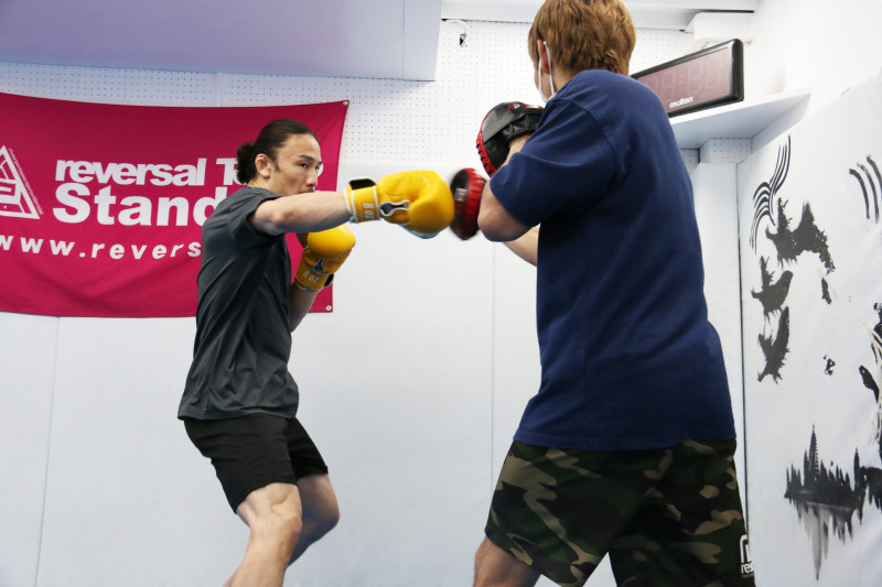 引っ掛けるような右フックを放つ矢地