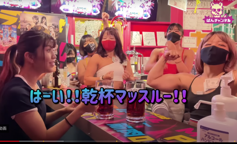 乾杯にも全員でマッスルポーズ!(『ぱんチャンネル_ぱんちゃん璃奈』より)