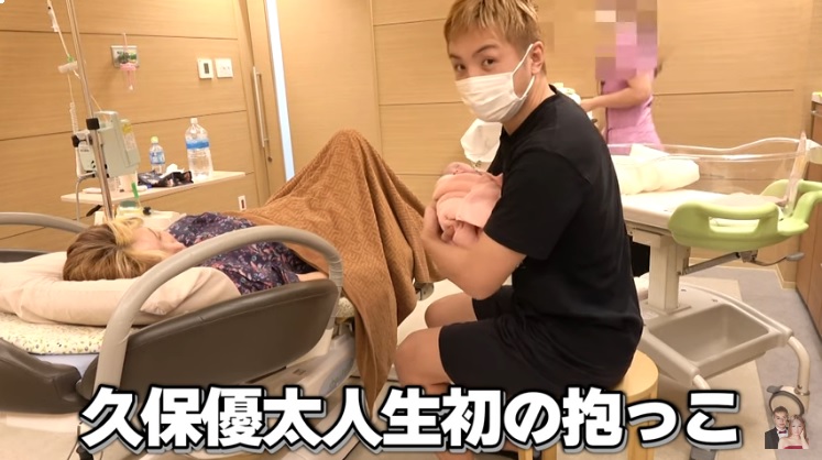 生まれたばかりの赤ちゃんを抱っこする久保(YouTube「サラ久保ちゃんねる」より)
