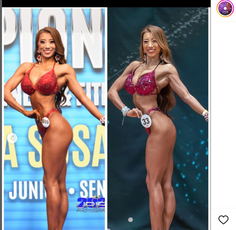 1年前(左)と今月1日の安井友梨のボディ。右のほうが肩の盛り上がり、二の腕の筋肉、広背筋の厚み、ウエストの絞り、ふくらはぎの筋肉も進化している。(安井友梨尹sぬたより)