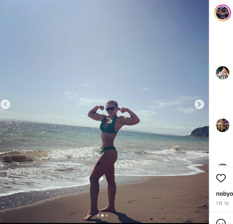 海辺、水着でマッスルポーズを決める平田(22年7月)@_itsuki_h_より