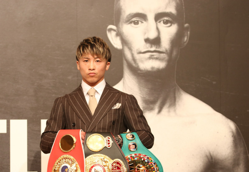 3団体のベルトを持つ井上尚弥、背景の壁にはバトラーの写真(13日会見にて)