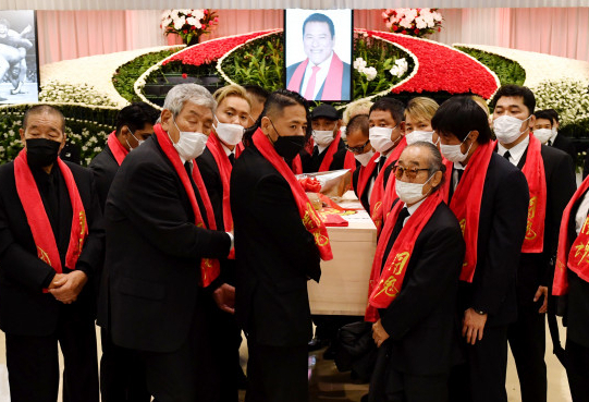 新日本プロレスの選手やOBらが「炎のファイター」に合わせ棺を運び出した。左から藤原喜明、坂口征二、オカダ・カズチカ、中邑真輔、藤田和之、蝶野正洋、永田裕志、棚橋弘至、手前がレフェリーのタイガー服部©IGF