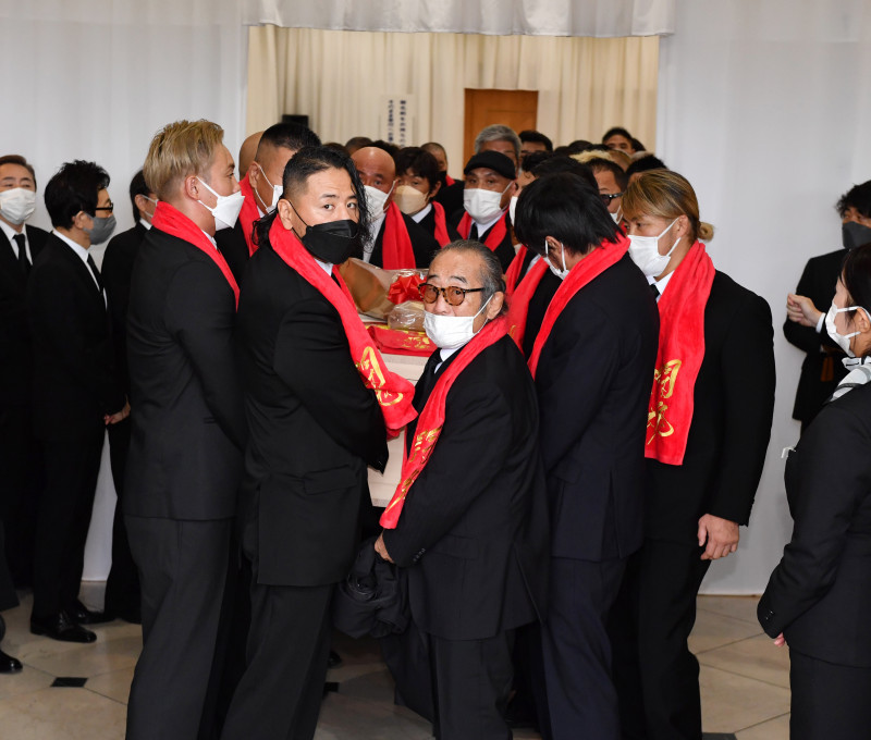 新日本プロレスの選手やOBらが「炎のファイター」に合わせ棺を運び出した©IGF