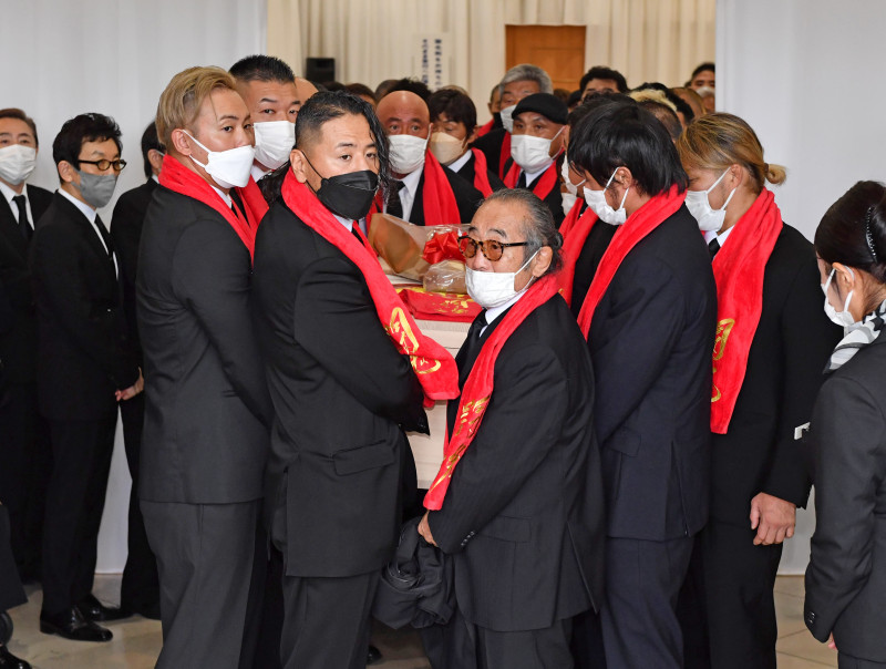 新日本プロレスの選手やOBらが「炎のファイター」に合わせ棺を運び出した©IGF