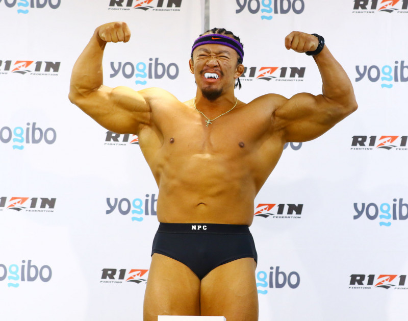RIZINの計量でマッスルポーズの北村さん(21年11月RIZIN沖縄)