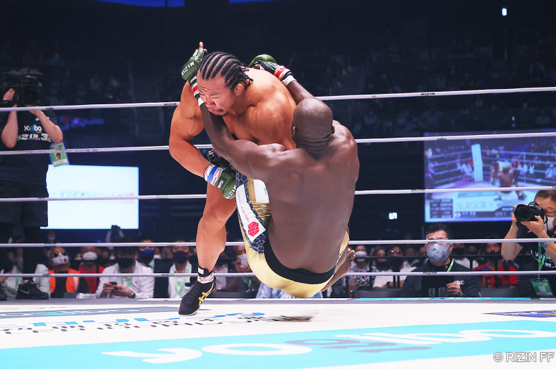 ボビー・オロゴンにタックルを決める北村(21年11月RIZIN沖縄)