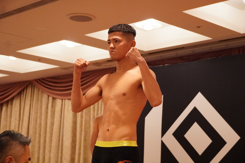 鋭い眼光で計量パスする西岡