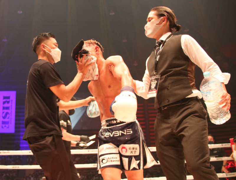 試合直後、ふらつきコーナーに戻るYA-MAN
