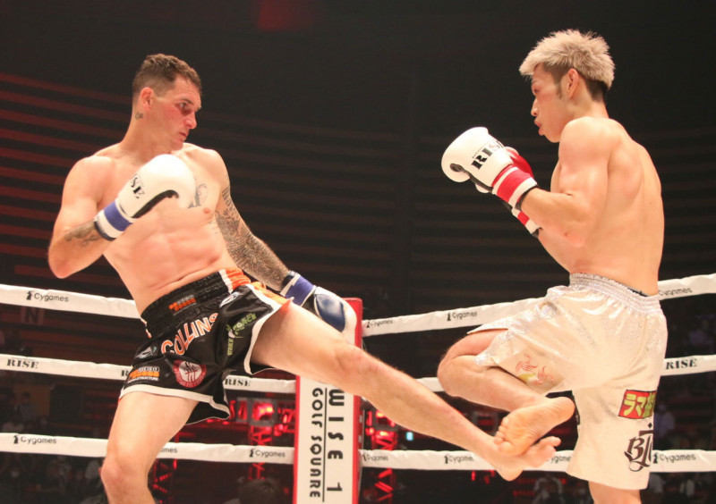 直樹(右)にローキックを蹴るチャド・コリンズ(左)