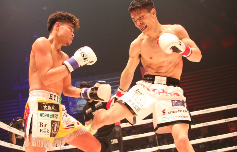KENTAに鬼の形相でローキックを蹴る小川(右)