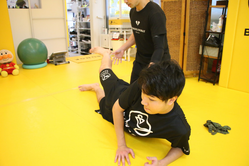 横向きに寝て、足を曲げずに上へ挙げる