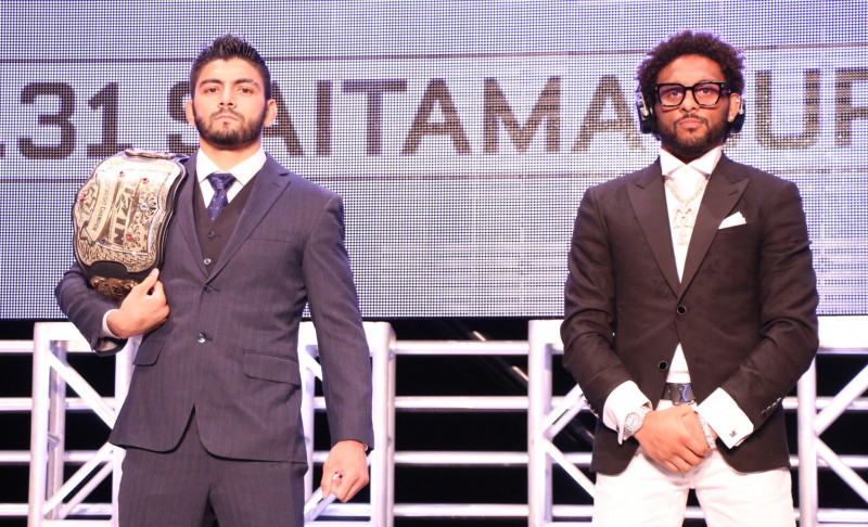 サトシ・ソウザ(左)とAJ・マッキーが会見で並ぶ