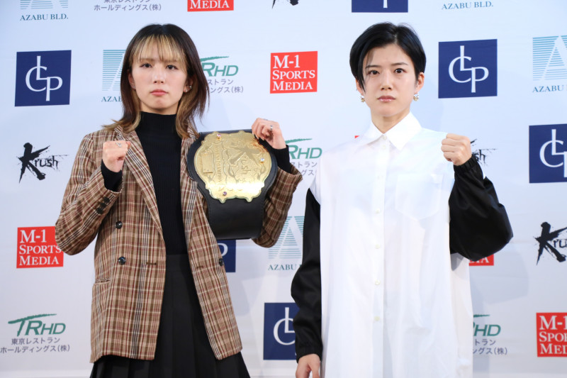 Krush女子アトム級タイトルマッチに臨む女王・菅原(左)と挑戦者のチャン・リー(右)