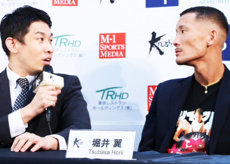 会見中に言い争いを行う中村プロデューサー(左)と堀井(右)