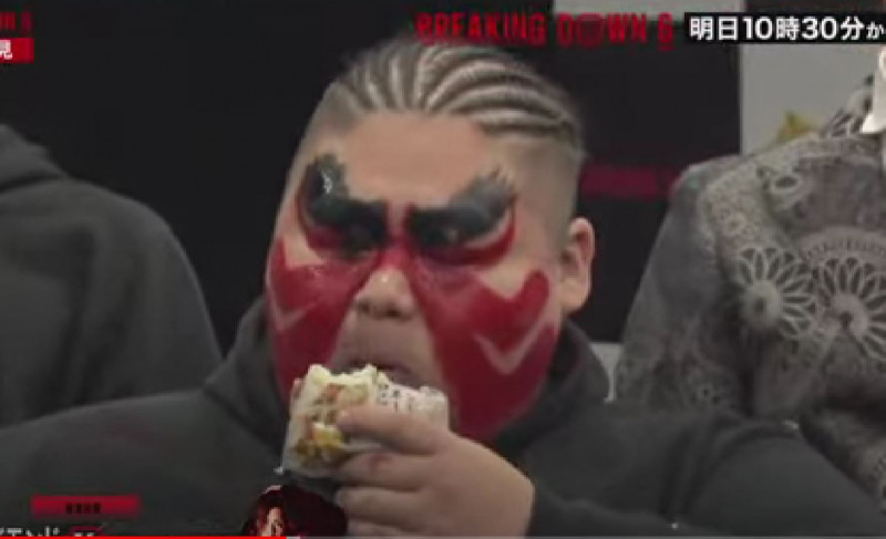 ド派手な顔面ペイントでおにぎりを食べるエドモンド