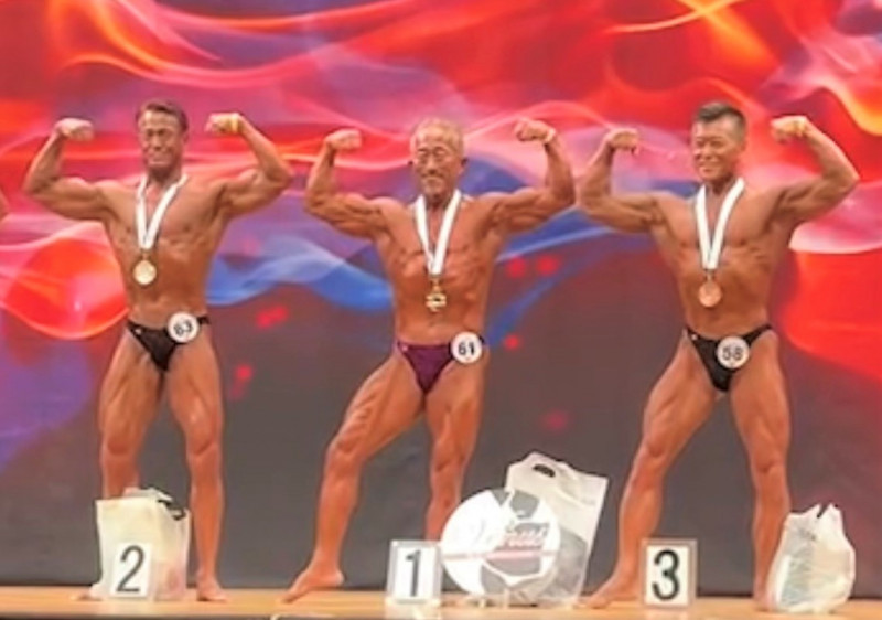 ボディビルの全日本マスターズで日本一に輝いた角田(中央、写真=本人提供)