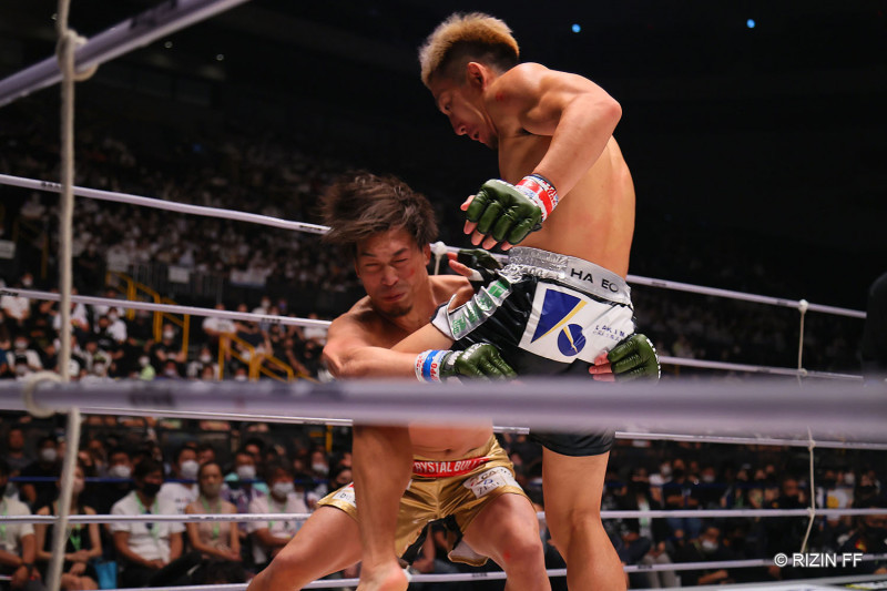 五輪レスラー太田のタックルにヒザを合わせる元谷