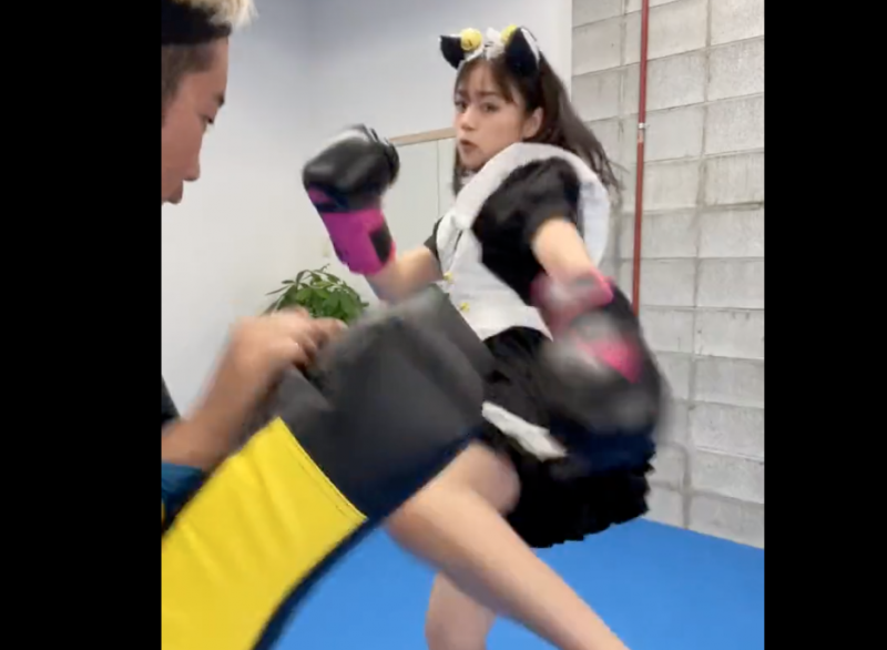 長野じゅりあがミニのメイド服でミット打ち(長野じゅりあTwitterより)