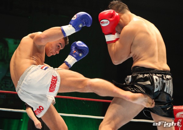 蹴りを放つサンティーノ・ヴェルビーク(左/2018年4月)