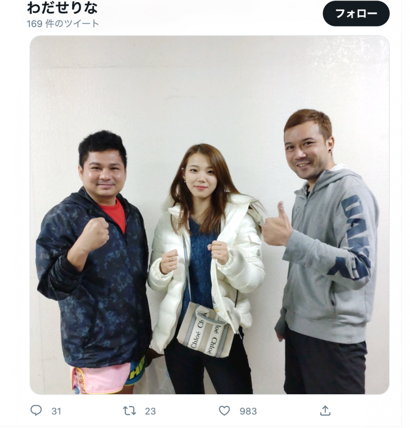 【フォト 8枚】せりな(中央)が試合後、練習をつけてもらったと思われる元WBAボクシング王者のテーパリット(左)やムエタイのWMC王者のプーパンレックと記念撮影(わだせりなTwitter @032sr より)