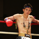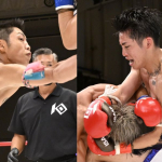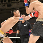 ヒザ蹴り連打でTKO勝利する壱・センチャイジム(奥/2022年7月)