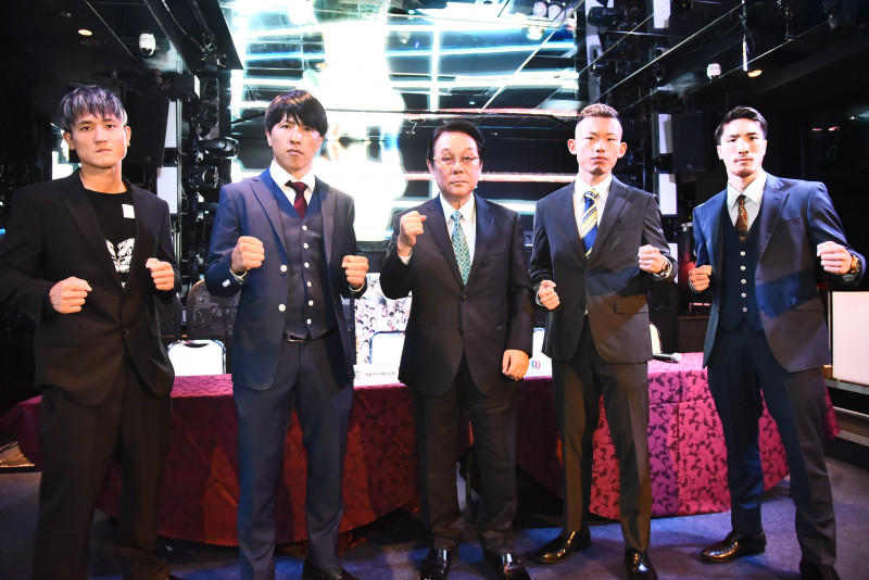 ウェルター級Explosionトーナメントに出場する(左から)小川健晴、山際和希、野村太一、FUMIYA。中央は谷山会長