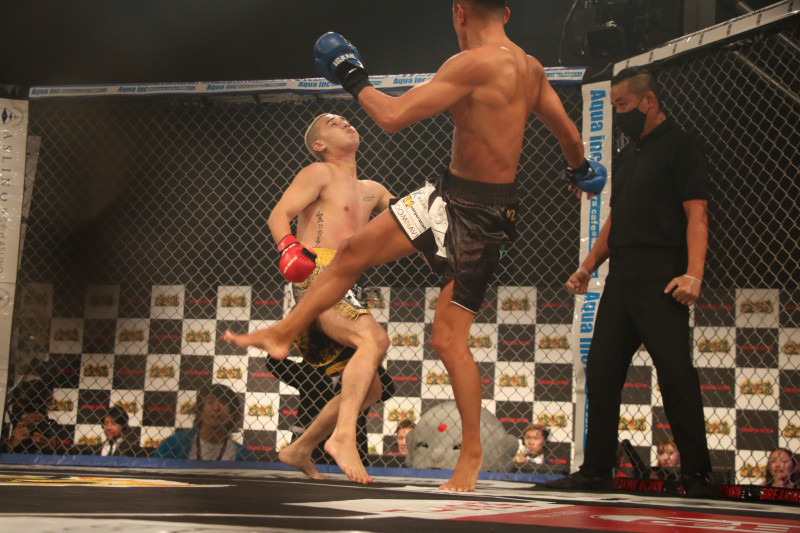 【写真5枚】2、ハイキックがこめおのアゴにヒット