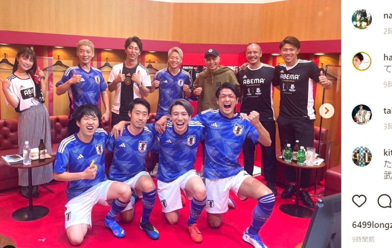 武尊がABEMAのサッカー応援番組に大岩と出演し、日本代表の勝利を喜んだ(武尊Instagramより)