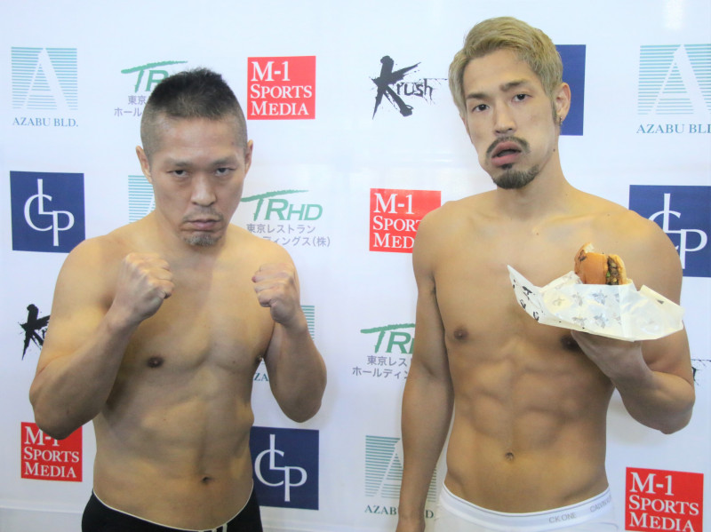48歳大月(左)と対戦する東本(右)はハンバーガーを食べながら計量をパス