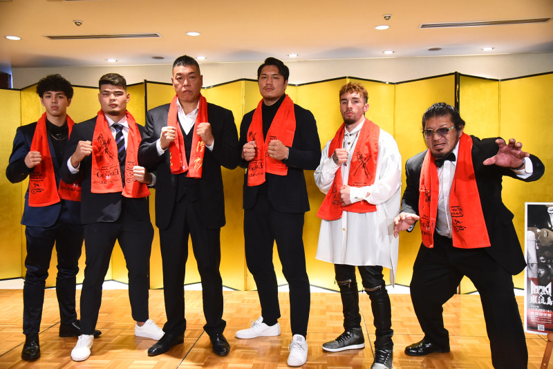 会見に出席した(左から)宇佐美、イゴール、小川、シビサイ、木村、関根