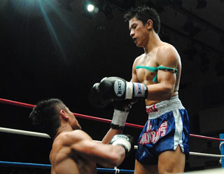 エークピカート(左)の左ヒジが炸裂!石井(右)はマットに沈んだ