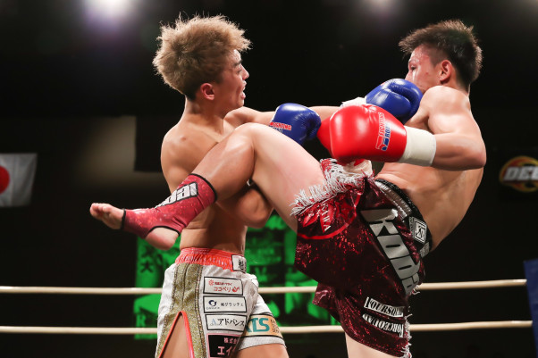 滉大(右)と政所(左)の激しい打ち合い=19年