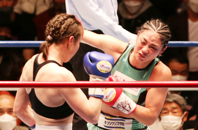 腫れた顔も気にせず、果敢に打ち合いにいく藤原茜(右)