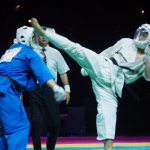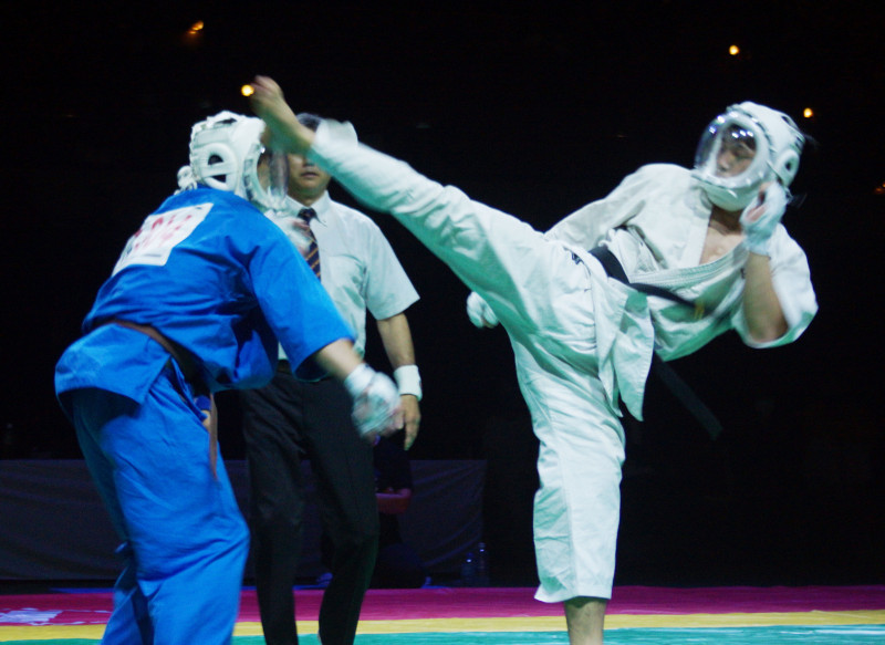 空道のアジア大会で上段回し蹴りを決める岩﨑、優勝し王者となった(20年11月)