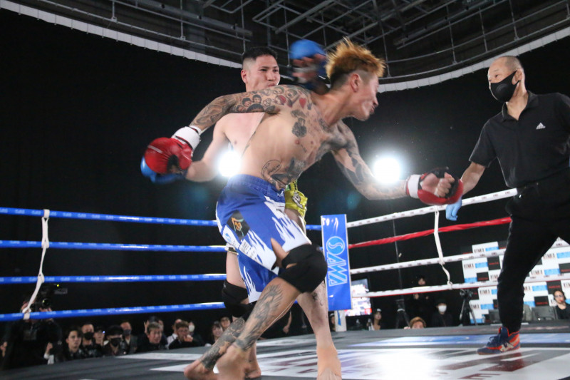 エイリアンニキ(奥)のパンチをもらうおでんツンツン男(手前)