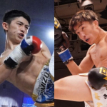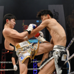 強烈なヒザ蹴りを突き刺す名高(左)